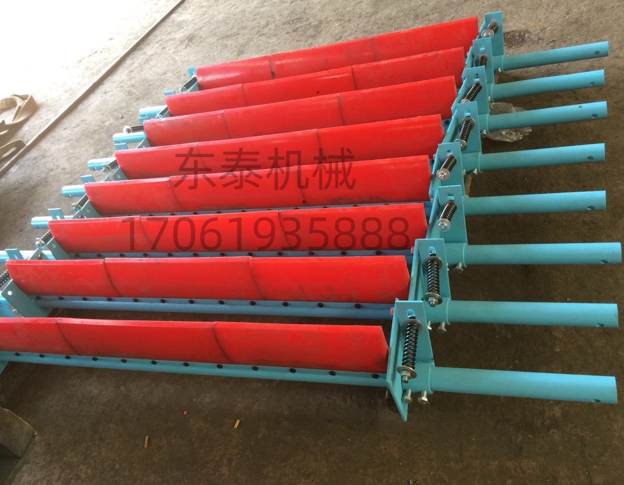 清掃器在輸送機上有著不可忽視的作用。在運行中,如果人為的清除機尾滾筒附著物,往往容易發生嚴重人身傷亡事故。而清掃器有及時、方便地、快速的清除滾筒附著物的特點。