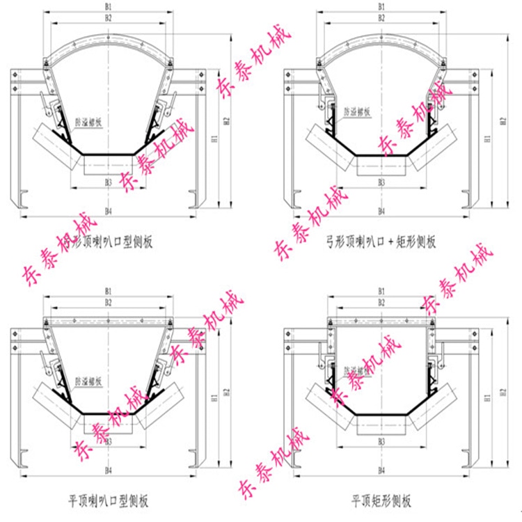 在輸送帶的下面,將原槽型托輥組更換為短槽型托輥組,用來支撐輸送帶的物料重力部位。輸送帶的兩邊非重力部位,用帶有減摩耐磨材料的底板來支撐,即支撐輸送膠帶,又可起密封作用,此支撐底板同側板連接在一起,側板同頂板連接在一起,共同組成殼式密封結構。導料槽的底邊寬度為2/3-1/2帶寬導料槽的截面形狀分為:矩形和弧形兩種。導料槽設計分為后擋板、槽體、前簾三個部分設計。裝于帶式輸送機的受料處約束物料不往外撒落導料槽:可使從漏斗落下的物料在達到帶速之前集中到輸送帶的中部。導料槽的底邊寬度為2/3-1/2帶寬導料槽的截面形狀分為:矩形和喇叭形兩種。導料槽設計分為后擋板、槽體、前簾三個部分設計。