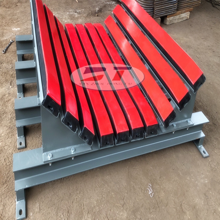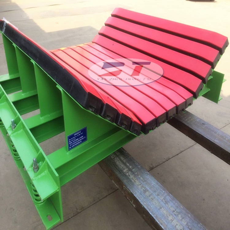 緩沖床主要用于替代緩沖托輥,緩沖床由緩沖條組成,而緩沖條主要應用優良的高彈性橡膠層充分有效吸收了物料下落時的沖擊力,大大降低了物料下落時對輸送帶的沖擊,真正的了落料點的受力狀況。