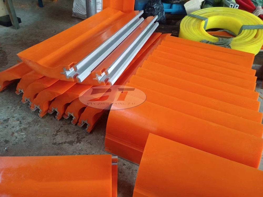 刮刀采用聚氨酯復(fù)合材料,利用模具一體加硫成形,刮刀面平整,直線度好,低摩擦、高耐磨、高強度,具有穩(wěn)定的刮料效果。可有效清除殘留皮帶上之細粒、濕粘物料。預(yù)壓式調(diào)壓器確保刮刀與皮帶的穩(wěn)定接觸壓力。刮刀面由多塊窄幅聚氨脂刮板組成,具有空形緩沖孔,對各種皮帶都有良好跟隨性。
