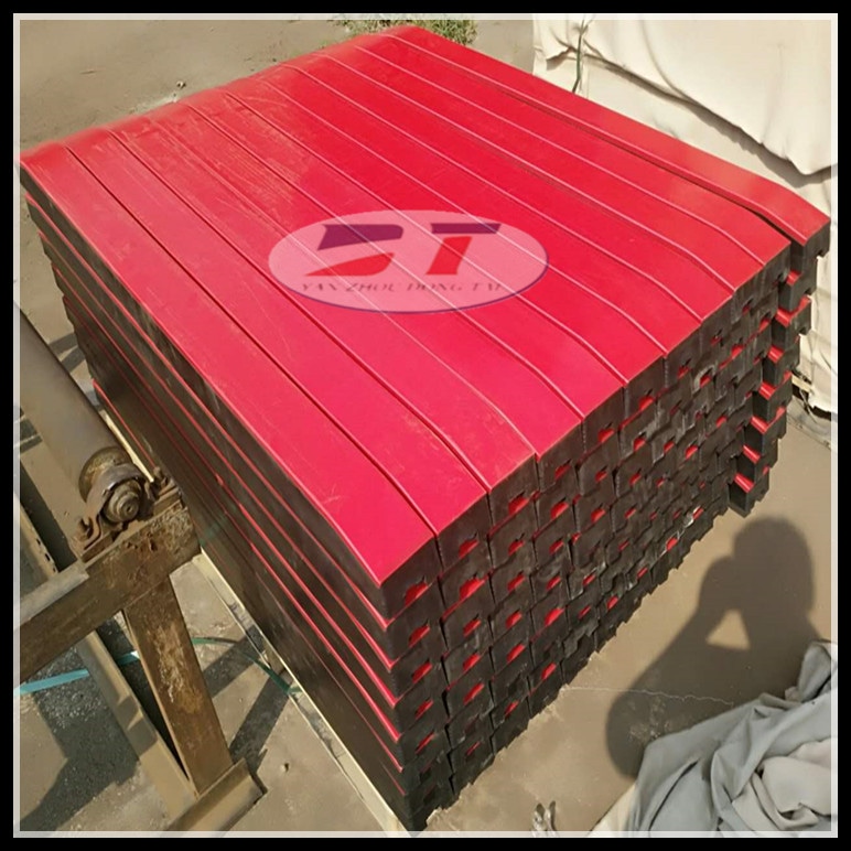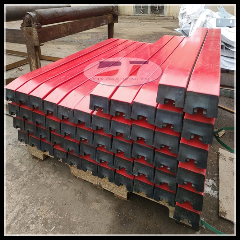 緩沖條各部分粘接采用的是熱硫化設計工藝,將500萬以上超高耐磨材料與硬度小于55的天燃橡膠及鍍鋅鋼構一體硫化成型,穩定性好、耐磨性好,使用壽命長,結構簡單,易于安裝和維護,在高強度沖擊作用下,不會發生緩沖條竄條、條體變形或者粘接不牢的情況。緩沖條耐磨層主要指的是超高分子量聚乙烯板,其分子量影響到期性能,不同的分子量影響到耐磨性能、耐沖擊性能一個合適的分子量也會影響到緩沖條性能,對于阻燃抗靜電緩沖條必須采用的是特定的適用于井下專用的材料,這一點與一般的廠家不同,因此品質較好。緩沖條表面材料摩擦系數小、耐磨性好、橡膠彈性高吸收沖擊能量強、獨特鋼結構設計。阻燃緩沖條接觸面的兩端成弧形,有效地保證了輸送帶的平滑運行。獨特的配方和施工工藝確保了緩沖條表層和橡膠的粘接強度。阻燃緩沖條有三部分構成,超高分子聚乙烯板,天然橡膠,鋼結構。通過熱硫化的粘接工藝將三部分牢固的連在一起。使阻燃緩沖條在使用過程中不出現,開裂,攢條等現象。在落料高的緩沖區域(轉載點)對輸送帶的巨大沖擊力,同時降低輸送帶運行時對輸送帶的摩擦力。